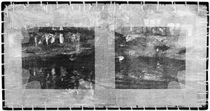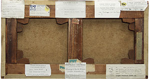 Das Gemälde entstand auf einem sehr feinen, handelsüblich weiß vorgrundiertem Gewebe, wie es im Werk Morisots häufig anzutreffen ist [vgl. Morisot, WRM FC 710 und 602]. Die genaue Aufspannung des Bildes ist aufgrund weitreichender Restaurierungseingriffe am Bildträger nicht mehr genau nachzuvollziehen, jedoch gibt es Anhaltspunkte, die kurioserweise auf eine Befestigung innerhalb der Bildfläche hindeuten (Abb. 5, 6). Die Unterzeichnung des Bildes erfolgte vermutlich in zwei Stadien. Bei mikroskopischer Untersuchung finden sich partielle Häufungen von in der Farbe eingebetteten schwarzen, kohleartigen Partikel, die sich zwar nicht mehr zu einer konkreten Linie rekonstruieren lassen, aber auf den Gebrauch eines Kohlestiftes für die erste Bildanlage hinweisen könnten (Abb. 8). Es liegt nahe, dass die ungebundenen Kohlepartikel mit den nachfolgenden Farbaufträgen verwischt wurden und diffus in die Malschicht eingebettet worden sind. Auf diese vermutlich erste zeichnerische Anlage folgte eine flüchtige, stellenweise lasierende Pinselzeichnung mit schwarzer Farbe (Abb. 9).