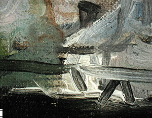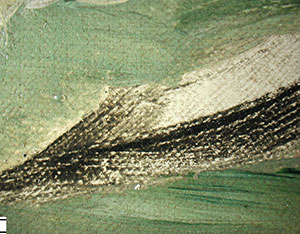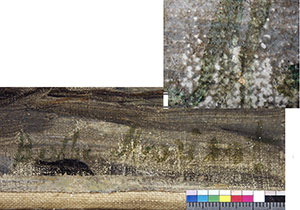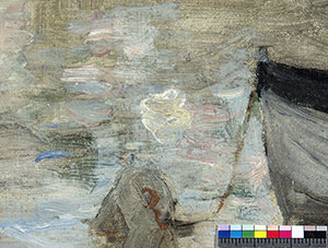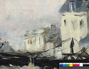 Die anschließenden Farbaufträge sind ebenfalls vorwiegend lasierend, nass in nass vermalt mit deutlichen Auslassungen bis auf darunter liegenden Schichten (Abb. 10). Im Gegensatz dazu wurden die weiß ausgemischten Partien der Häuserzeile und des Himmels dichter und pastoser angelegt (Abb. 4). Innerhalb des Schaffensprozesses lassen sich verschiedene, eher geringfügige Veränderungen ablesen, darunter farbliche Korrekturen, aber auch eine partielle mechanische Reduktion bereits aufgetragener Farbschichten wie beispielsweise in den hellblauen Lichtreflexen der Wasserfläche (Abb. 12). Erst nachträglich folgte die Signatur mit lasierend grüner Farbe auf die bereits getrocknete und vermutlich durch Handhabung und Lagerung beriebene Farbschicht (Abb. 7).
