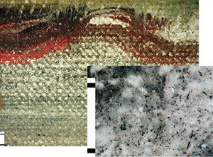 feine Holzkohlepartikel weisen auf eine erste Unterzeichnung mit einem Kohlestift hin, Mikroskopaufnahme (M = 1 mm)