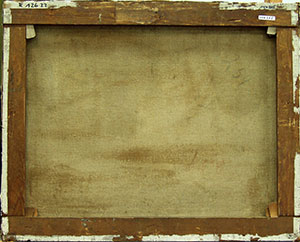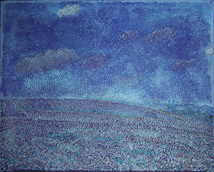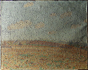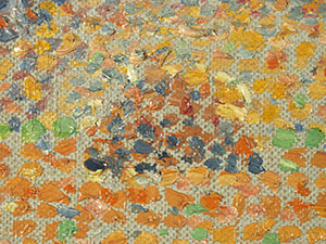 Das von Vogt in das Jahr 1903 datierte, jedoch vom Künstler selbst mit „02“ signierte Gemälde (Abb. 7) zeigt eine Landschaft mit Blick auf eine Stadt, die bislang nicht näher lokalisiert werden konnte, möglicherweise aber zur Umgebung von Weimar zählt [Vogt 1978, Kat. Nr. 293]. Das Bild entstand zu einer Zeit, in der Rohlfs als Akademie-Professor nach Weimar berufen wurde und sich erstmals mit der Malweise der französischen Pointillisten auseinandersetzte. Als Bildträger wählte er ein Gewebe, bei dem sich jeweils zwei parallel verlaufende Kett- und Schussfäden alternierend überkreuzen (Abb. 11). Diese so genannte Panamabindung ist eine Abwandlung der traditionellen Leinwandbindung und stellt dieser gegenüber eine vergleichsweise selten anzutreffende Webart textiler Bildträger zu Malzwecken dar. Aller Voraussicht nahm er selbst die Aufspannung und Grundierung des Gewebes vor. Den hellblauen Farbton der Grundierung scheint Rohlfs bereits gezielt auf seine geplante Landschaftsdarstellung abgestimmt zu haben. Auf diese Weise konnte er im Bereich des Himmels die nachfolgenden kurzen Farbpunkte und -striche locker aneinandersetzen und dabei in ökonomischer Weise den Farbton der Grundierung in die Komposition mit einbeziehen Abb. 11). In der farbigen Ausgestaltung der Landschaft kommt der helle Blauton der Grundierung durch Simultankontraste mit den überwiegend rein pigmentierten Farbaufträgen unterschiedlich zur Geltung, was ebenfalls Absicht des Künstlers gewesen sein mag (Abb. 9, 10). In der Landschaft variieren zum Bildvordergrund hin zunehmend Anordnung, Dichte und Pastosität der Farbpunkte- und striche. Interessanterweise erscheint der Farbauftrag in Formen der Darstellung, die zuvor grob mit einem Stift unterzeichnet wurden, systematischer (Abb. 9, 10). Bei Farbaufträgen, die sich überschneiden oder gar übereinander liegen, sind Durchmischungen oder zumindest Verformungen in den angetrockneten Oberflächen der Pinselstriche und -tupfen festzustellen (Abb. 8, 12). Dies weist auf eine insgesamt zügig erfolgte Ausführung des Gemäldes hin, auch wenn schon aufgrund der Malweise mehrere Arbeitssitzungen zu vermuten sind.