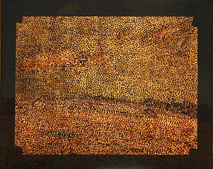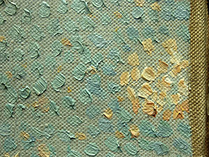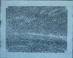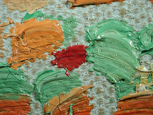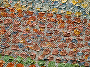 In Größe und Anordnung variierende Farbaufträge, die sich zur Gestaltung des mittleren Heuhaufens vermehrt überdecken, Mikroskopaufnahme