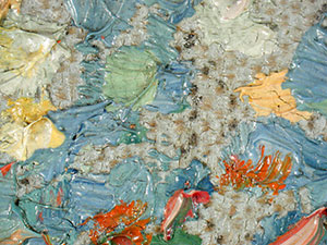 Nass in nass nebeneinander und übereinander gesetzte Farbpunkte und auffallende Craquelébildung, die sich ausgehend von der Grundierung teilweise auch bis in die Malschicht fortsetzt, Mikroskopaufnahme