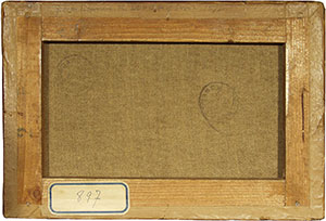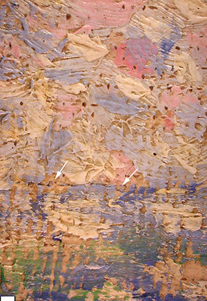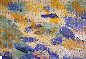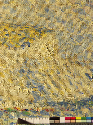 Für die kleine Studie verwendete Lemmen das Standardformat P2 als bereits aufgespannte und grundierte, also vorfabrizierte Ware. Das einfache, recht dünne und weitmaschige Tuch in Leinwandbindung entspricht zusammen mit der einschichtigen Grundierung (à grain) wohl dem Typus toile étude, der über die Handelskataloge erschließbar ist. Auf der weißen Grundierung unterzeichnete Lemmen die wesentlichen Konturen mit schwarzem Stift, um dann zunächst die Hauptflächen der Komposition hellfarbig anzulegen (Abb. 7, 8). Auf diesen Farbflächen differenzierte und modellierte er mit gezielt gesetzten Pinseltupfern, bei denen die Abfolge des Farbauftrages gut nachvollziehbar ist. Viele Bereiche sind nass in nass gearbeitet und bezeugen das rasche Fortschreiten der Arbeit. Die helle Grundierung spricht in vielen Bildbereichen mit und ruft den duftigen Charakter der Arbeit hervor (Abb. 9). Leider ist durch eine Doublierung und eine unsachgemäß durchgeführte Firnisabnahme einiges an ursprünglicher Delikatesse der Farbwirkung verloren gegangen (Abb. 10-12).