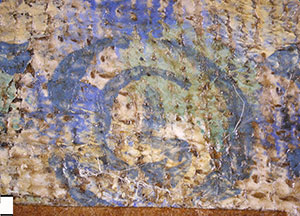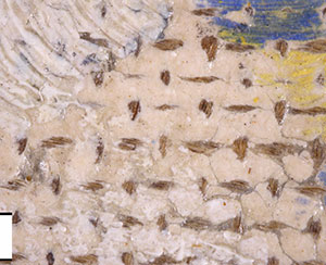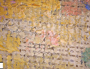 Detail, getupfter Farbauftrag, Mikroskopaufnahme (M = 1 mm)