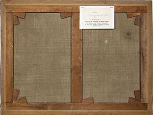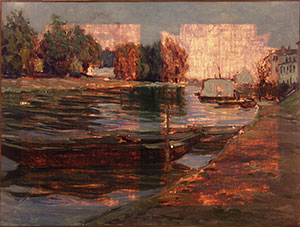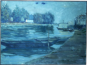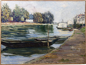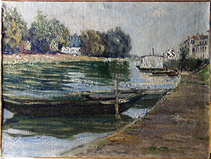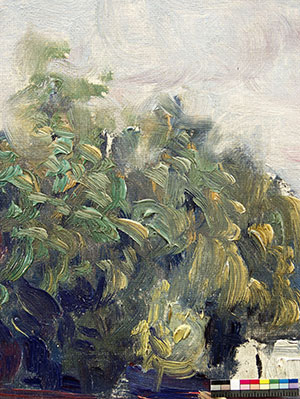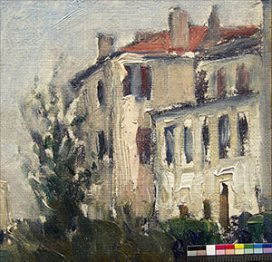 Die Seine mit ihren begrünten Uferzonen, pittoresken Häusern und Booten zählte zu einem der Lieblingsmotive Caillebottes in diesen Jahren [Berhaut 1994, S.224-231, vgl. Caillebotte WRM Dep. FC 603]. Für die hier vorliegende Darstellung wählte der Künstler ein weiß vorgrundiertes, feines, netzartiges Gewebe - ähnlich der damals handelsüblichen Studienleinwände toile étude oder toile pochade. Mit zügigen dunklen Pinselstrichen skizzierte er die Umrisse von Häusern, Bäumen und Booten auf die weiße Grundierung, bevor er die einzelnen Motive mit dünnen Farbaufträgen flächig im jeweiligen Lokalton untermalte (Abb. 7, 8, 9). Mit breiten Pinselstrichen wurde die Darstellung anschließend zügig und vornehmlich nass in nass geschlossen (Abb. 10, 11, 12). Im Bereich der linken unteren Ecke sind halbrunde Wisch- und Kratzspuren festzustellen, die offensichtlich entstanden, als die Farbaufträge noch frisch waren (Abb. 6). Zwar lassen sie sich nicht eindeutig auf einen bestimmten Gegenstand zurückführen, könnten aber auf die Handhabung des Bildes bei Befestigung und Transport in freier Natur hinweisen. Das heutige Erscheinungsbild des Gemäldes ist maßgeblich von der Doublierung beeinflusst, zu deren Folgen deutliche Deformationen und Verpressungen pastoser Farbaufträge zählen sowie die Entfernung des originalen Umspann und eine geringe Formatverkleinerung.