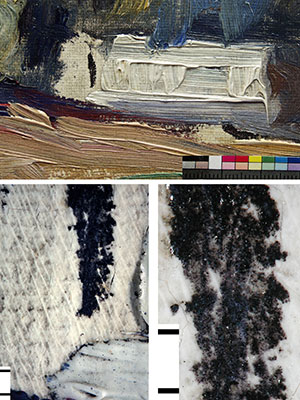 Details der Unterzeichnung bzw. Untermalung im Haus oder Schuppen am linken Ufer, unten: Mikroskopaufnahmen (M = 1 mm)