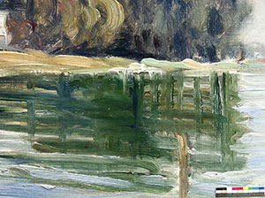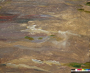 Detail des rechten Uferweges, zweischichtiger Malschichtaufbau mit ersten flächigen, dünnschichtigen Farbaufträgen im Lokalton und darüber gesetzten pastosen Pinselstrichen