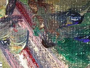 Nass in nass vermalte Farbaufträge, Mikroskopaufnahme (M = 1 mm)