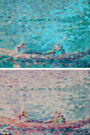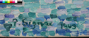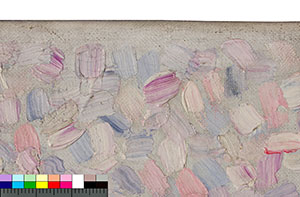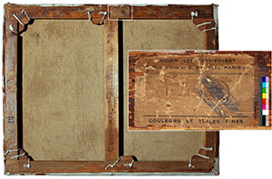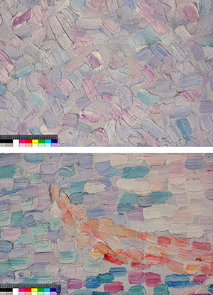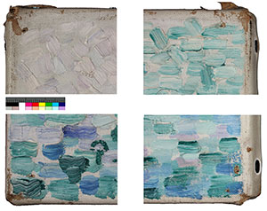 Anfang des 20. Jahrhunderts besuchte Paul Signac einige der großen Häfen Europas, darunter Marseille, Venedig, Rotterdam, London, La Rochelle und 1907 auch Konstantinopel, das heutige Istanbul. Dabei sammelte er seine bildlichen Eindrücke in Zeichnungen und Aquarellen, um später im Atelier einige dieser Ideen in divisionistischer Manier auf die Leinwand zu bringen. Sein ins Jahr 1909 datiertes Gemälde „Stamboul, Yeni Djami“, wie Signac den Titel mitsamt Signatur und Datum handschriftlich auf der Rückseite des Keilrahmens notierte, entstand nach einer solchen Aquarellstudie, die das Motiv des Bildes bereits präzise vorgibt (Abb. 13). Signac führte seine Malerei auf einer handelsüblich cremeweiß grundierten Leinwand im querrechteckig verwendeten Standardformat Figure 25 aus, die er einem rückseitigen Etikett zufolge beim Künstlerbedarf Lucien Lefebvre-Foinet in Paris erwarb (Abb. 2). Um seiner Darstellung maximale Lumineszenz zu verleihen, trug er eine weitere reinweiße Grundierungsschicht auf, wie er sie in seiner Schrift „D’Eugène Delacroix au néo-impressionisme“ bereits propagierte: „Es ist merkwürdig, wie die Neo- Impressionisten selbst in den kleinsten Details ihrer Technik die Ratschläge Delacroix praktisch befolgen. Sie malen nur auf weiss präpariertem Grund, weil dessen Licht die farbigen Pinselstriche durchleuchtet und ihnen so mehr Glanz und Frische verleiht.“ (Signac 1908, S. 24; Abb. 9). Ein Teil des Motivs, wie die Moschee und das Segelboot am linken Bildrand sowie das Ruderboot im Vordergrund, wurden vom Künstler mitsamt der Horizontlinie in Graphit- oder Bleistift auf die Grundierung gezeichnet (Abb. 6, 8). Der nachfolgende in divisionistischer Maltechnik ausgeführte Farbauftrag folgt genau dieser Unterzeichnung ohne weitere Änderungen in der Komposition vorzunehmen. In regelmäßigem Rhythmus liegen die einzelnen Farbstriche nur teilweise leicht überlappend nebeneinander, wobei zwischen ihnen Freiräume entstehen, in denen die weiße Grundierung und auch Teile der Unterzeichnung sichtbar bleiben. Gemäß der neoimpressionistischen Farbtheorie folgen die mit Weiß und den im Spektrum benachbarten Farben ausgemischten Farbaufträge in pastosem Duktus der Richtung des jeweiligen Motivs (Abb. 10). Erfreulicherweise ist das Gemälde bis heute ungefirnisst geblieben und bewahrt damit den authentischen, von Signac beabsichtigten, matten Oberflächencharakter der Malerei.