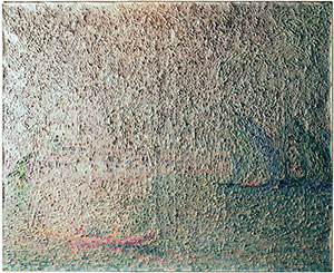 Detail oberer Bildrand, reinweißer Grundierungsauftrag auf der cremefarbenen, handelsüblich vorgrundierten Leinwand